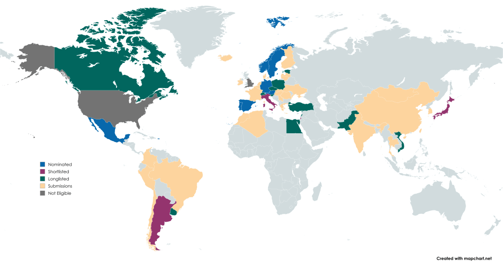 | Longlist: 24 🇨🇦 Canada 🇨🇿 Czechia 🇪🇬 Egypt 🇪🇪 Estonia 🇱🇧 Lebanon 🇵🇰 Pakistan 🇵🇱 Poland 🇸🇮 Slovenia 🇨🇭 Switzerland 🇹🇷 Türkiye 🇺🇾 Uruguay 🇻🇳 Vietnam |
